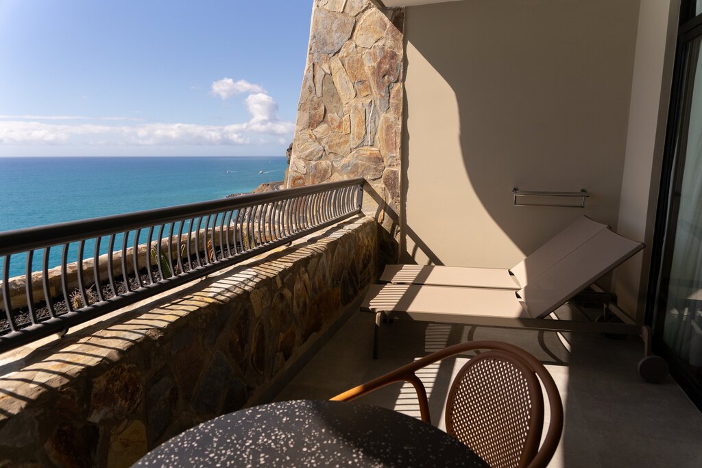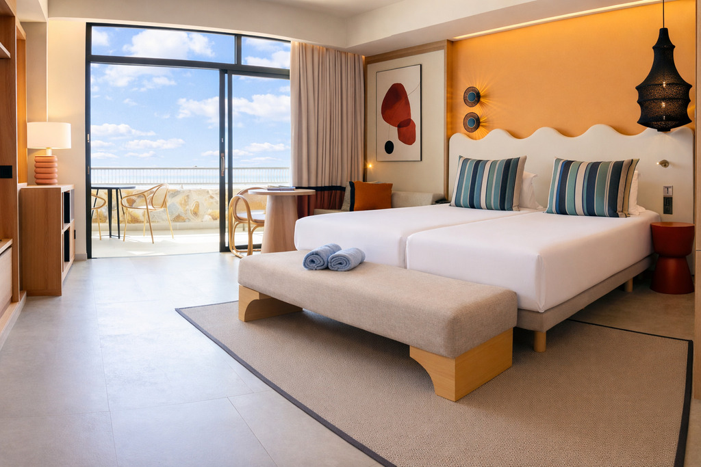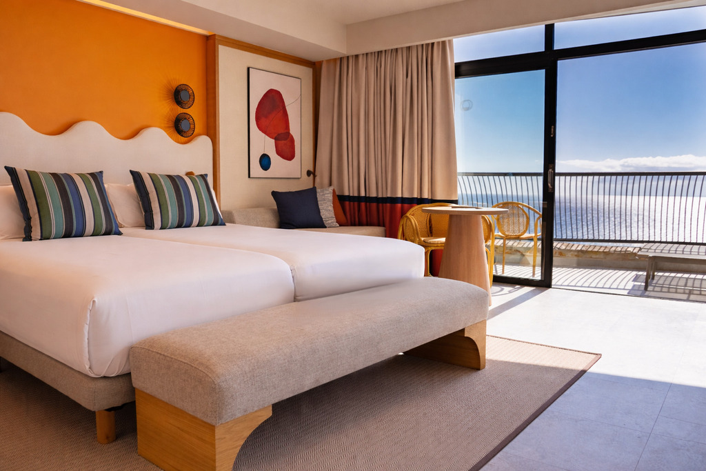 Amplias habitaciones con zona de estar y sofá cama. Confortables, elegantes y luminosas con terraza y vista piscina. Para que su estancia sea perfecta, le recomendamos la piscina puesta en forma de nuestro Centro de Talasoterapia (situado en el bloque 4). Descuento para huéspedes del hotel.